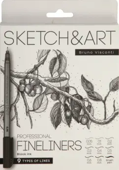 Набор из 9 линеров черного цвета с абсолютно разной толщиной линии: 0,05 мм, 0,1 мм, 0,2 мм и 0,3 мм. 0,4 мм, 0,5 мм, 0,6мм и 0,8 мм. Дополнительный приятный бонус – кисть.