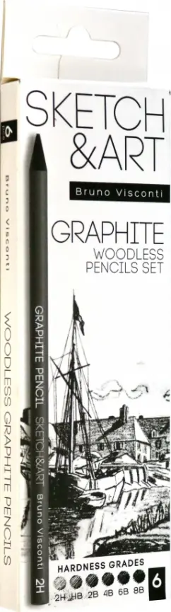 Набор цельнографитовых водонерастворимых карандашей разной степени мягкости: 2Н, НВ, 2В, 4В, 6В, 8В. Предназначен для создания любых видов графических работ. Карандаши различной степени мягкости хорошо сочетаются между собой, позволяя создать едва уловимые вариации тонов и оттенков. Карандаш состоит из пишущего графитового стержня без деревянного корпуса, покрытого лаком, благодаря чему руки остаются чистыми.