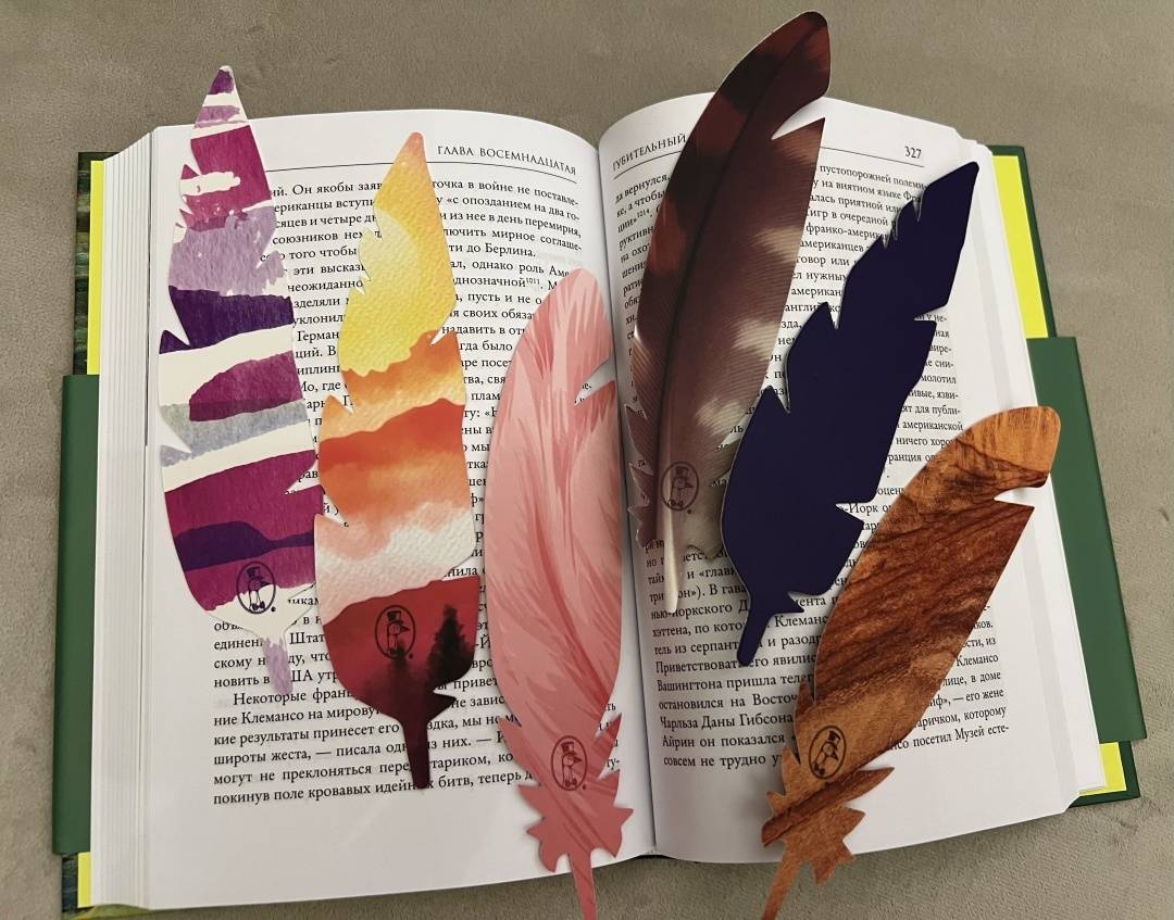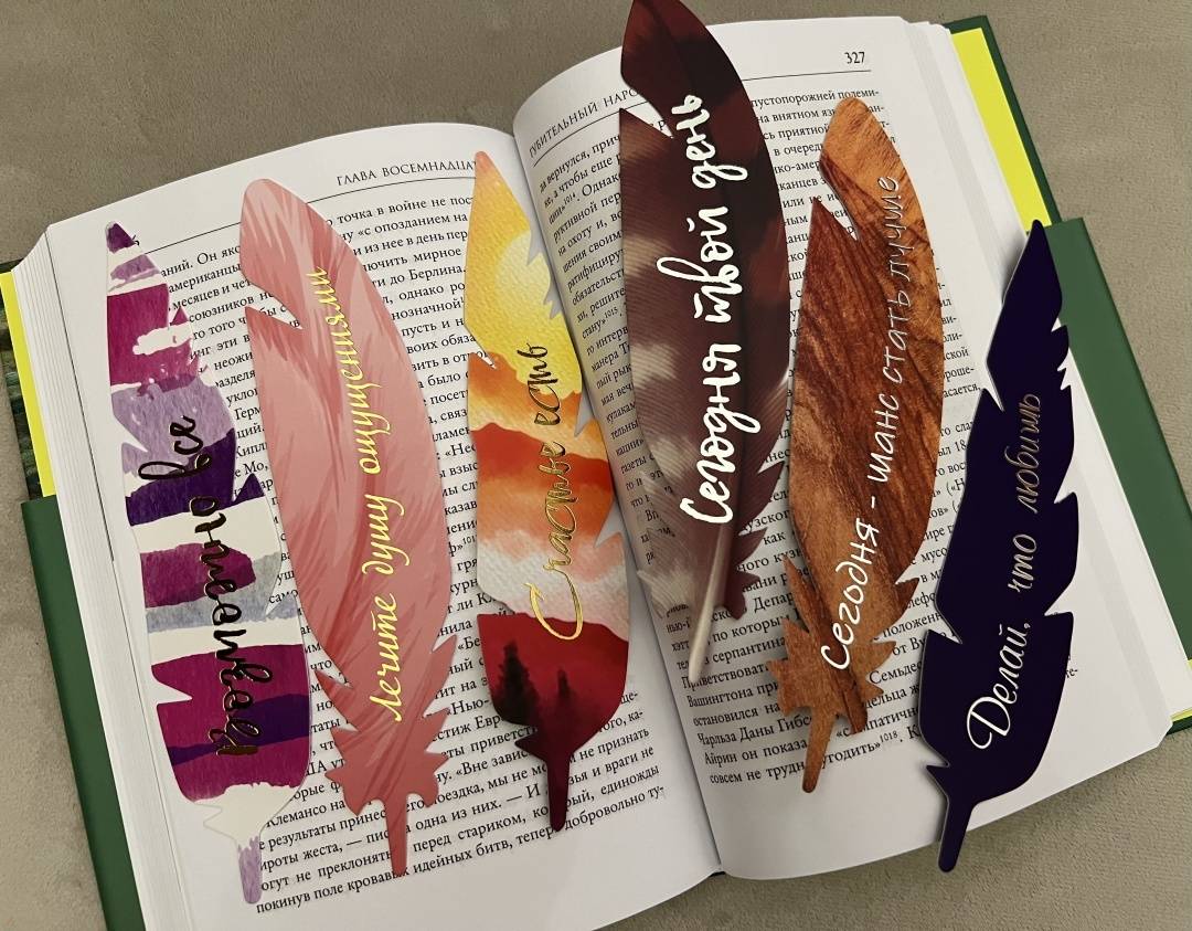 Заказала оба набора с закладками - пёрышками и не пожалела. В каждом наборе по шесть закладок, повторяется только одна - с оформлением "под дерево". Закладки довольно крупные, плотные, сделаны качественно. Оригинальные и красивые. Рекомендую.
