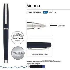 Cтильная перьевая ручка «SIENNA» синего цвета с контрастирующими элементами в цвет серебра. Благодаря покрытию Soft Touch пальцы не скользят по корпусу ручки, письмо комфортное и легкое. Ручка оснащена высококачественным механизмом подачи чернил, благодаря которому линия остается однородной и аккуратной. Чернила не токсичны, на основе водорастворимого красителя, не забивают фидер. Перьевой наконечник выполнен из иридиума и дополнен орнаментом.