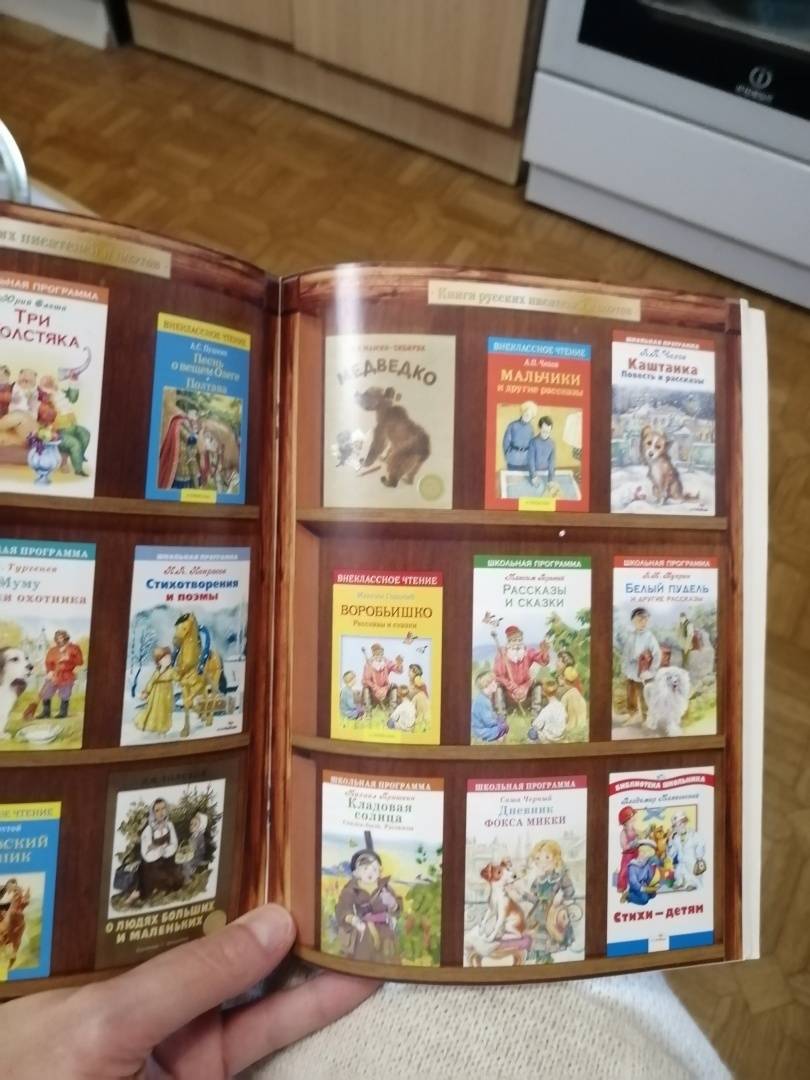 Очень интересная книга, информация представлена в доступной для детей форме. Выглядит как тетрадь, обложка из тонкого картона, глянцевая, листы белые, шрифт крупный, не яркий (не рябит в глазах). Иллюстрации только в середине справочника - книги писателей, на мог взгляд лучше бы сделали портреты писателей (из нет, дож...