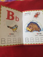 Маленькая книжечка, 48 офсетных страниц, обложка из тонкого картона, иллюстрации яркие, четкие. На каждом развороте буква , три слова на эту букву с русской транскрипцией и переводом, а также строчка прописи данной буквы.