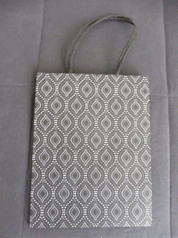 Пакет очень красивый, качественный и стильный, из плотной бумаги. Детали - печать точек белой краской на черной бумаге. Внутри пакет весь черный.