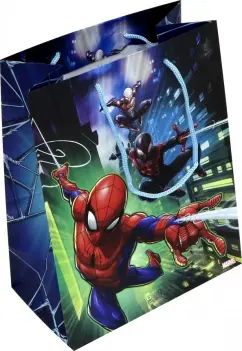 Бумажный пакет Человек-Паук, с ламинацией, с шириной основания 17,8 см, плотность бумаги 140 г/м2.