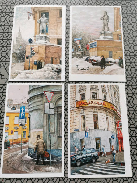 Красивые открытки, в них метко передано настроение и выбраны симпатичный места Москвы.