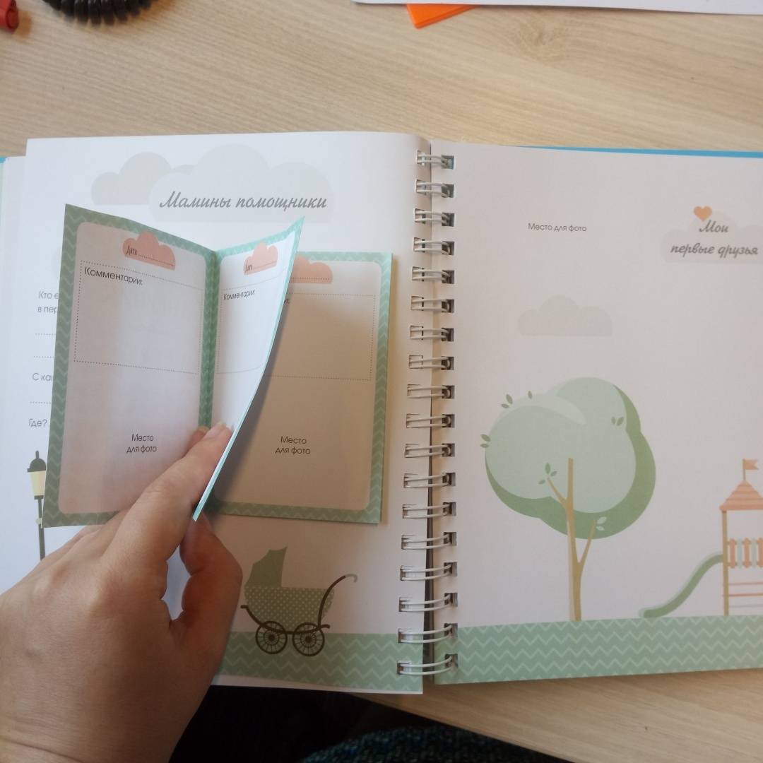 Супер-альбом, чего здесь только нет: ростомер, вставные мини-книжки, открывающиеся окошечки и т.п. Вклеивать фотографии, вписывать данные, а потом перелистывать – одно удовольствие. Плотная бумага, милое оформление, забавное пушистое ушко на обложке, поэтому можно рассматривать как подарок родителям малыша.