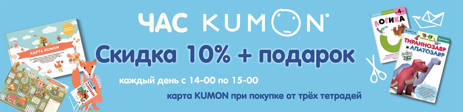 и карту KUMON за покупку трех тетрадей. Каждый день с 14:00 до 15:00