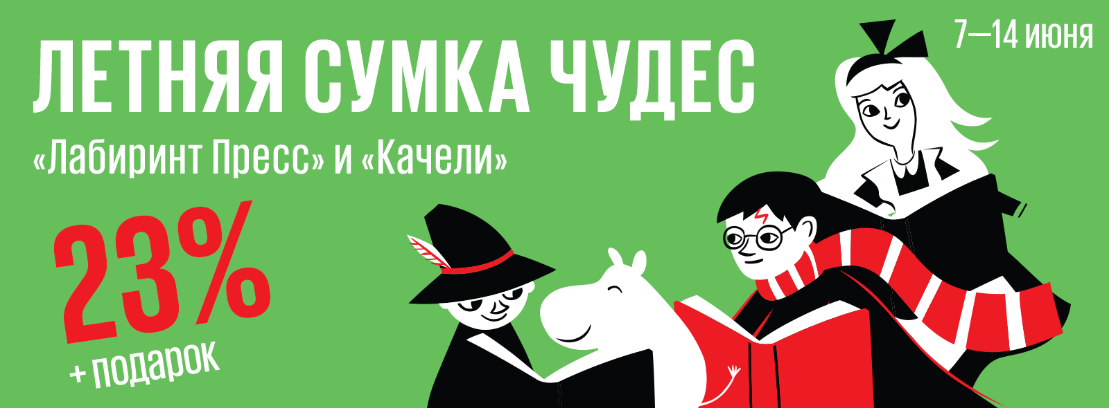 С 7 по 14 июня скидка 23% на книги издательств «Лабиринт Пресс», «Качели» и «Вектор-Детство»: сказки, раскраски или познавалки — все что угодно! А еще при покупке книг издательств от 1500 р. мы дарим сумку «Вселенная в книгах».