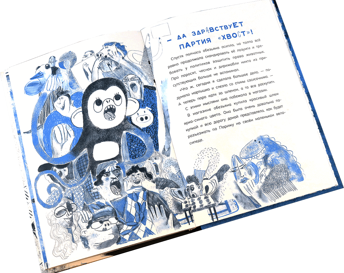 Над главной героиней мы думали вместе с Лерой. На мой взгляд, лучшее, что может случиться с иллюстратором, — когда сам автор четко описывает персонажа: черты и поведение. Набросав пару страниц мартышек, мы выбрали ту самую! Она оказалась немного чудаковатой, хитрой, ловкой и безумно милой.