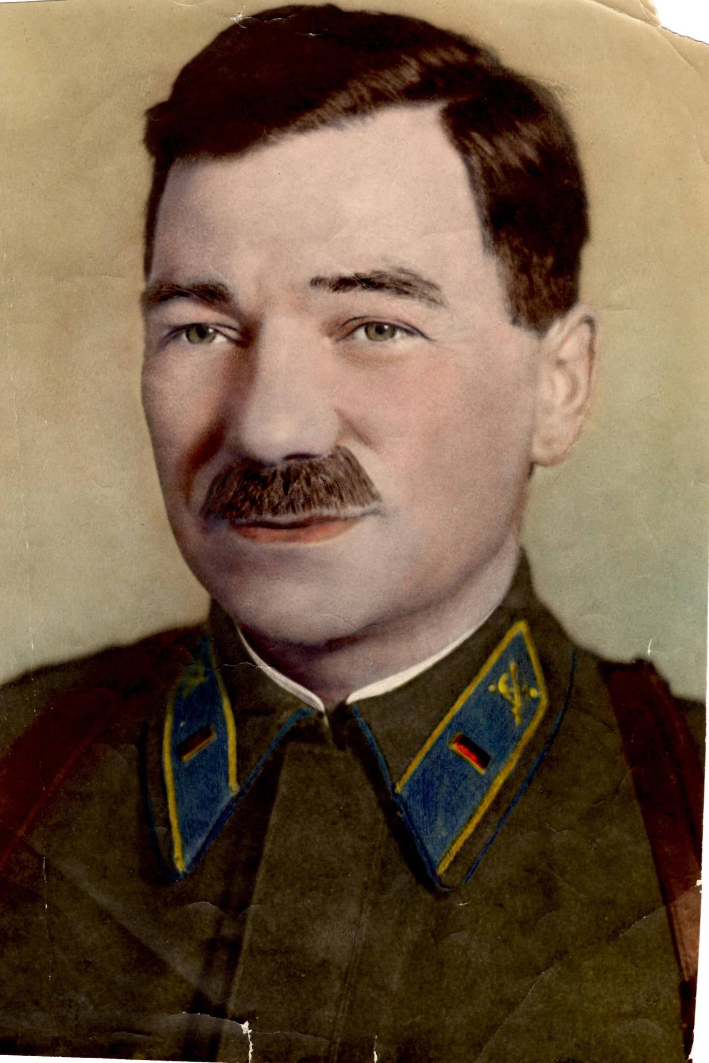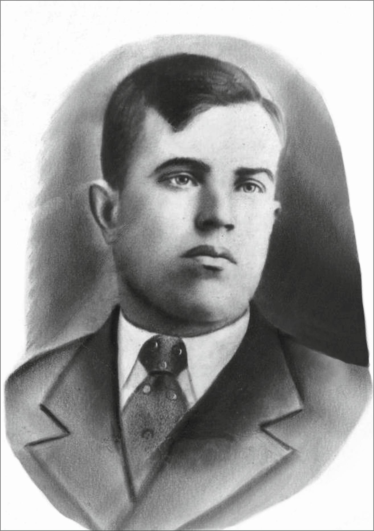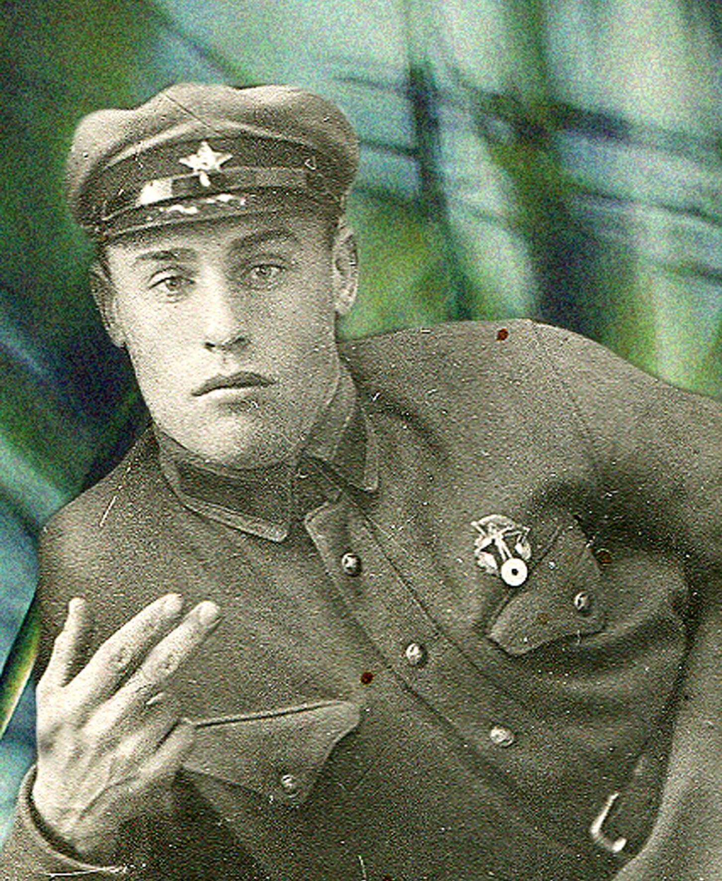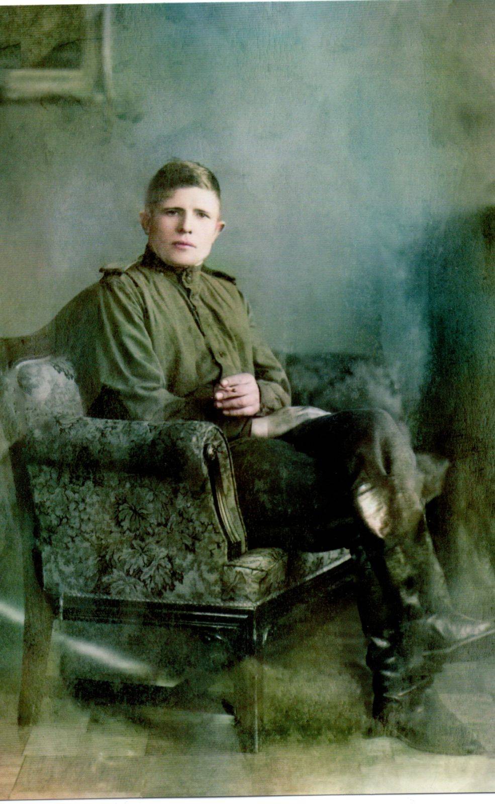 Пропал без вести в 1941. Родился и жил в Кустанайской области в Казахстане. Учился на ускоренных курсах летчиков в Новосибирске летом 1941. Отлично рисовал - это его автопортрет перед отправкой на фронт.
